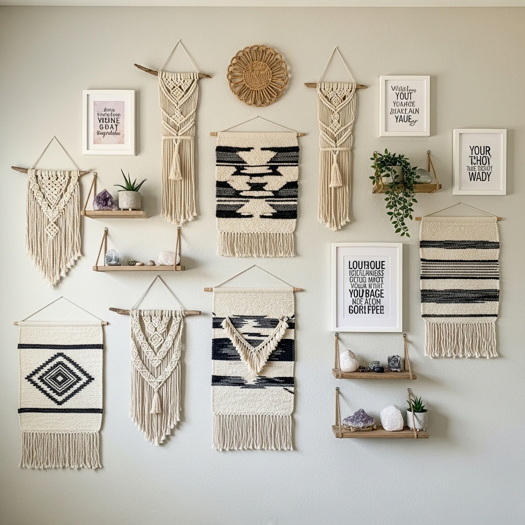 Transform a blank wall into an inspiration gallery using textural elements rather than traditional art. Mix macrame pieces, woven wall hangings, framed quotes that motivate you, and small shelves displaying meaningful objects. Arrange them in an organic composition that feels collected over time rather than perfectly planned. This approach adds depth and personality to your workspace while keeping visual interest at eye level during video calls. The textural elements also help with acoustics, making your space feel more comfortable. Create an inspiration wall with textural elements like macrame and woven hangings for visual interest.