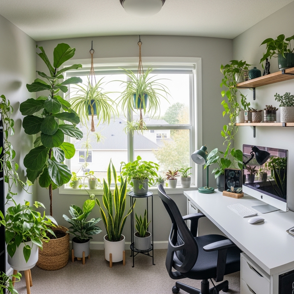 Incorporate plenty of plants to improve air quality and create a calming, nature-connected environment. Choose a variety of plants with different shapes, sizes, and textures to create visual interest. Include some hanging plants to utilize vertical space, and add a large statement plant like a fiddle leaf fig or monstera. Plants not only beautify your space but also reduce stress and increase productivity. Choose low-maintenance varieties if you’re new to plant care, and place them where they’ll receive appropriate light. Incorporate various plants to improve air quality and create a nature-connected workspace.