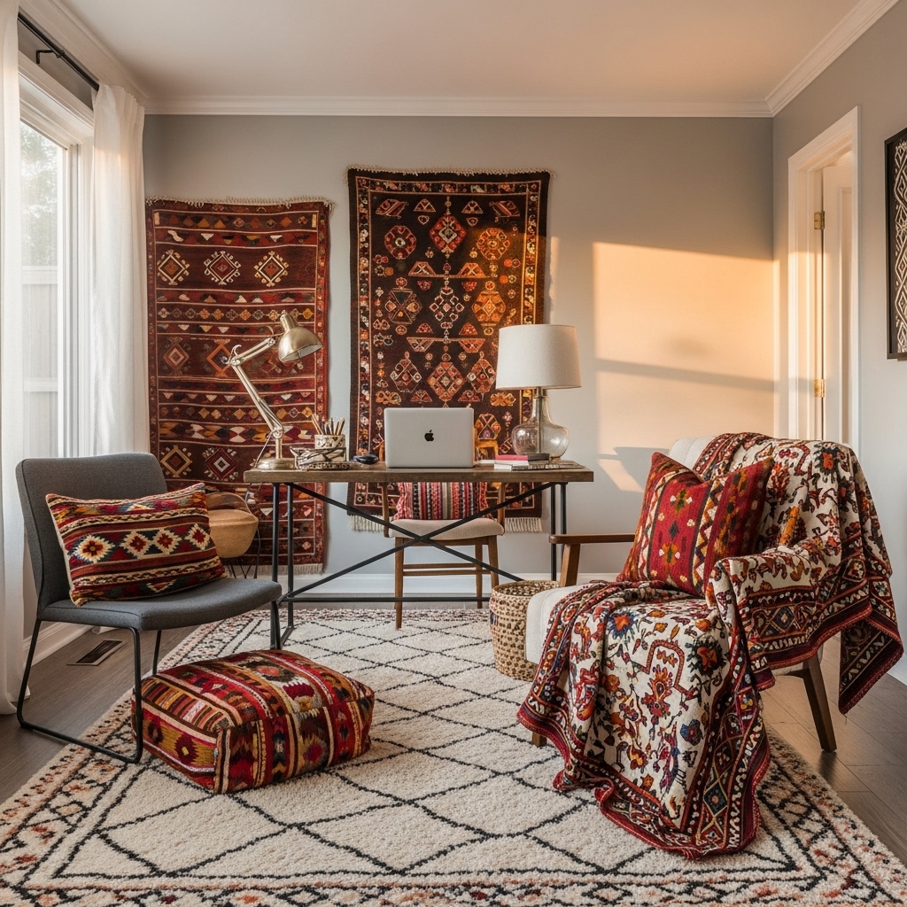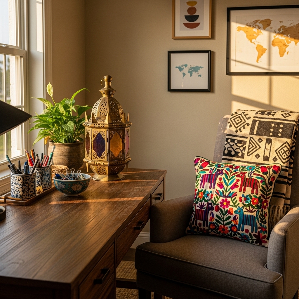 Layer global textiles throughout your office to add warmth, pattern, and cultural inspiration. Use a patterned rug to define your workspace, add throw pillows to your chair, and drape embroidered textiles over surfaces. Choose pieces from different cultural traditions that share a color story to create cohesion. These textiles not only add physical comfort but also visual interest that can spark creativity during your workday. They help absorb sound, making your space acoustically comfortable for focused work or calls. Add global textiles like rugs and throws for cultural inspiration and acoustic comfort.