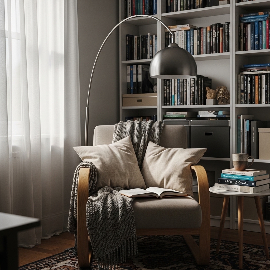 Create a dedicated reading area within your office for research, breaks, or creative thinking. Choose a comfortable chair with character, add excellent lighting for reading, and include a small table for your tea or books. Surround the area with shelves holding professional resources and inspirational reading material. This intentional space encourages taking productive breaks and provides a change of scenery without leaving your office, supporting both focused work and creative thinking. Include a reading nook for research,breaks, and creative thinking within your office space.