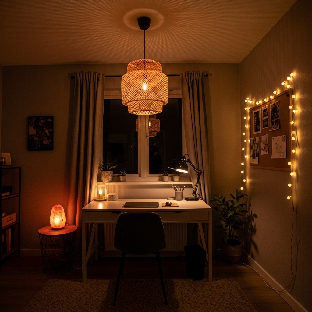 Layer multiple light sources to create a warm, productive atmosphere at any time of day. Include overhead lighting for general illumination, task lighting at your desk for focused work, and ambient lighting like salt lamps or string lights for cozy atmosphere. Use bulbs with warm color temperatures (2700K-3000K) to avoid harsh cool light. Dimmable options allow you to adjust lighting based on your tasks and time of day. Proper lighting reduces eye strain and creates a comfortable environment for both focused work and creative thinking. Layer multiple light sources for a warm,productive atmosphere that reduces eye strain.