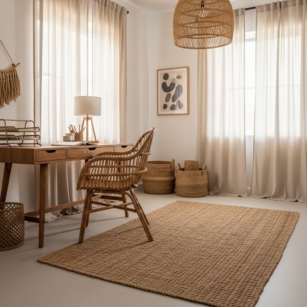 Use natural materials throughout your office to create a grounded, calming atmosphere. Choose a wooden or rattan desk, add a jute or seagrass rug, use bamboo organizers, and incorporate linen textiles. These materials bring organic texture and warmth that synthetic materials lack, creating a space that feels both professional and soothing. Natural materials also tend to be more sustainable, aligning your workspace with eco-friendly values. They help create an environment that supports both productivity and wellbeing. Use natural materials like wood,rattan, and jute for a grounded, calming workspace atmosphere.