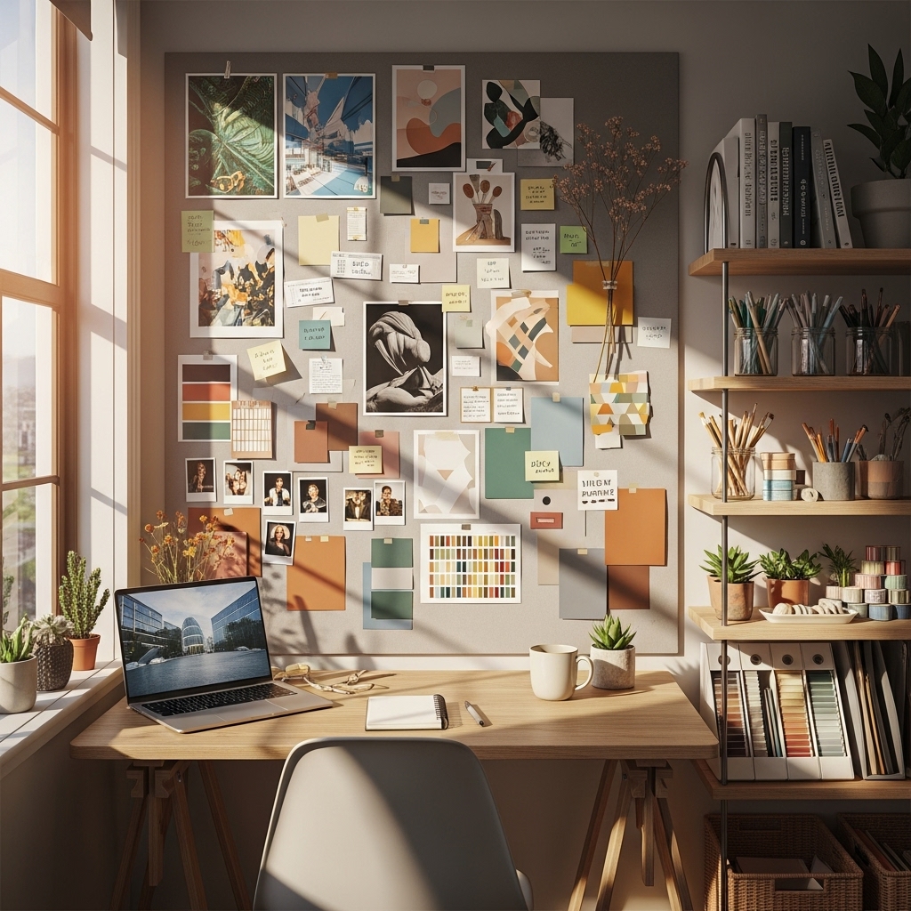 Create a large inspiration board for visual brainstorming and project planning. Use cork, fabric, or even a painted section of wall to display inspiring images, color schemes, project notes, and personal mementos. Arrange items organically rather than perfectly, allowing the board to evolve with your projects. This approach keeps your creative ideas visible and organized while adding personal style to your space. It’s especially valuable for visual thinkers and creative professionals who benefit from seeing their ideas spatially. Create a large inspiration board for visual brainstorming and project organization.