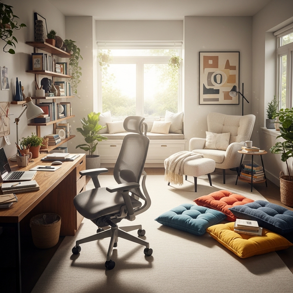 Incorporate multiple seating options to support different work activities and postures. Include an ergonomic desk chair for focused work, a comfortable armchair for reading or calls, and floor pillows for casual brainstorming or meditation. This variety encourages movement throughout your workday and provides options based on your task, mood, or energy level. Changing positions and locations within your office can boost creativity, focus, and physical comfort during long work hours. Include multiple seating options to support different work activities and encourage movement.
