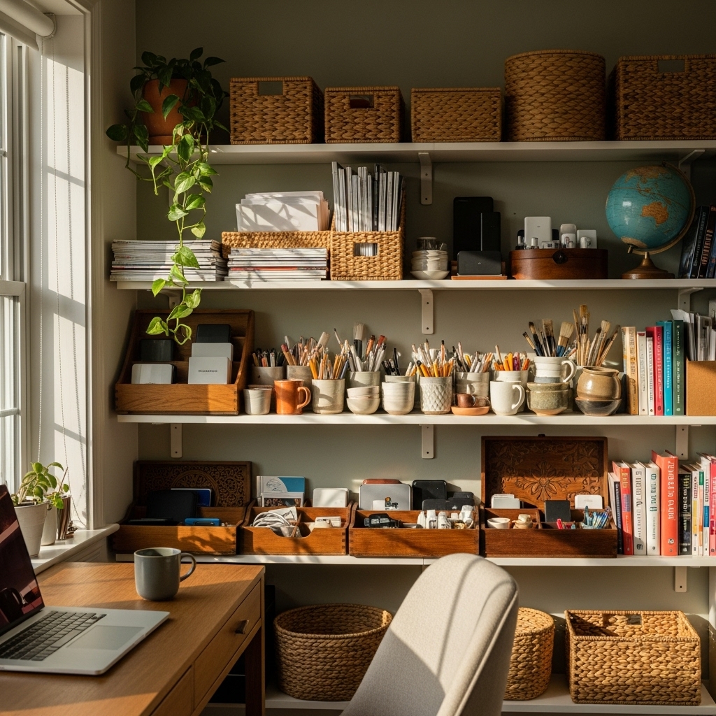 Develop an organization system that embraces creative accessibility rather than perfect minimalism. Use beautiful containers like woven baskets, ceramic vessels, and wooden boxes to corral supplies while keeping them visible and accessible. Open shelving allows you to display inspiring items while storing necessities. This approach acknowledges that creative work often involves visible materials and tools while maintaining enough order to support productivity. The system feels personal and inspiring rather than rigid or corporate. Create an organization system that embraces creative accessibility with beautiful containers.