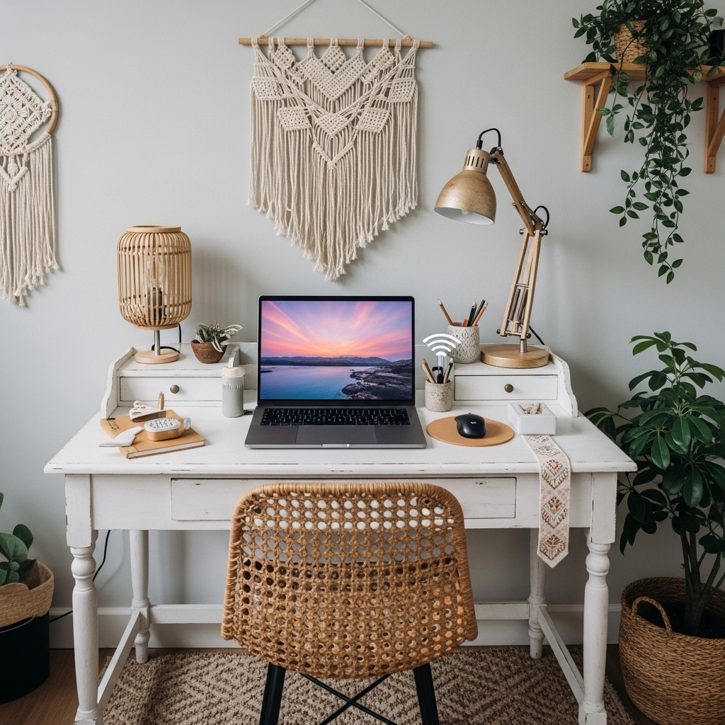 Seamlessly integrate technology into your boho office without compromising style. Choose tech accessories in natural materials or colors that coordinate with your decor. Use decorative solutions for cable management—woven cable sleeves, hidden routing, or attractive boxes that conceal power strips. Select wireless devices when possible to reduce visual clutter. The goal is to have technology serve your work without dominating the aesthetic, creating a space that feels both functional and beautifully bohemian. Integrate technology seamlessly with decorative solutions that maintain your boho aesthetic.