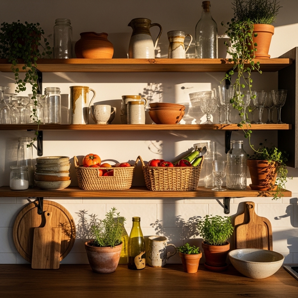Replace upper cabinets with open shelving to display your beautiful dishes and collections. Use sturdy wooden shelves that show their natural grain. Arrange items in groups—stack plates, lean cutting boards, and group glassware together. Leave some breathing space between items to avoid visual clutter. Incorporate functional items like frequently used oils and spices in beautiful containers. This approach makes everything accessible while turning your kitchenware into decorative elements that express your style. Showcase your beautiful dishes and collections with open shelving that combines function and style.