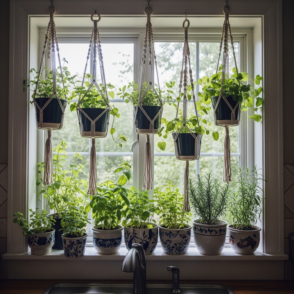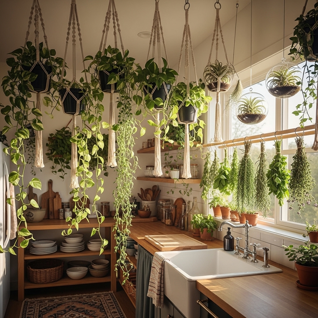 Utilize vertical space by hanging plants from the ceiling or walls. Use macrame hangers, wall-mounted planters, or hanging shelves for smaller plants. Choose plants that thrive in kitchen conditions—herbs, spider plants, or pothos are good options. This approach adds greenery without sacrificing precious counter space. The hanging plants create movement and life in your kitchen, purify the air, and bring nature indoors in a beautiful, space-saving way. Utilize vertical space with hanging plants that add life without sacrificing counter space.