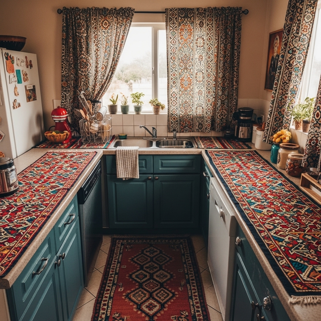 Incorporate global textiles to add warmth and pattern to your kitchen. Use durable, washable rugs in high-traffic areas. Add runner textiles on countertops where they won’t interfere with food preparation. Choose curtains that filter light while adding pattern and color. These textiles not only add visual interest but also help with acoustics in the often-hard kitchen surfaces. They bring a sense of comfort and worldly charm to your cooking space. Add warmth and pattern with global textiles that bring cultural charm to your kitchen.