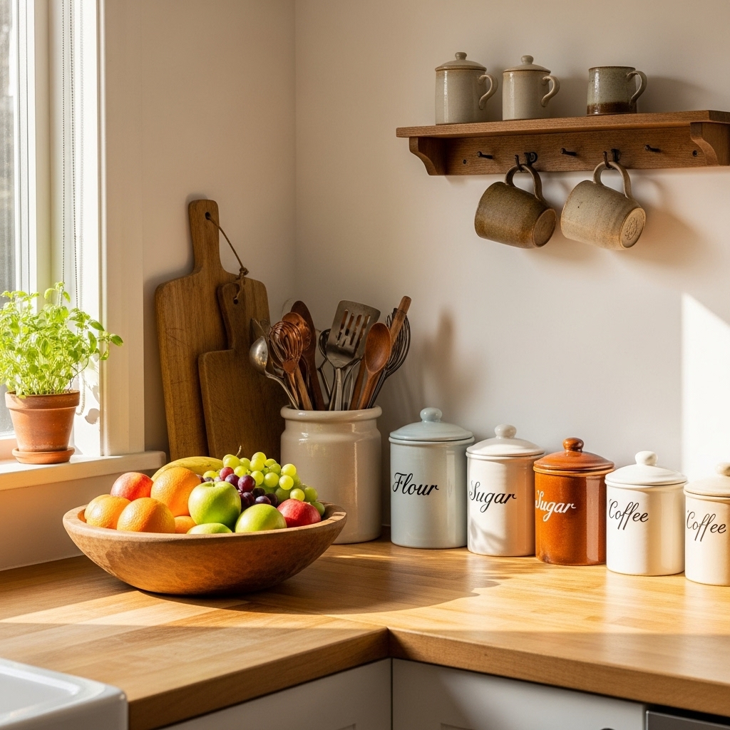Treat your countertops as display space for beautiful functional items. Group items in collections rather than scattering them randomly. Use wooden boards or trays to corral items and create intentional groupings. Choose containers that are both practical and beautiful—ceramic canisters for staples, wooden bowls for fruit, attractive oil and vinegar bottles. This approach keeps frequently used items accessible while turning them into decorative elements that express your style. Display beautiful functional items on countertops as both practical tools and decor.