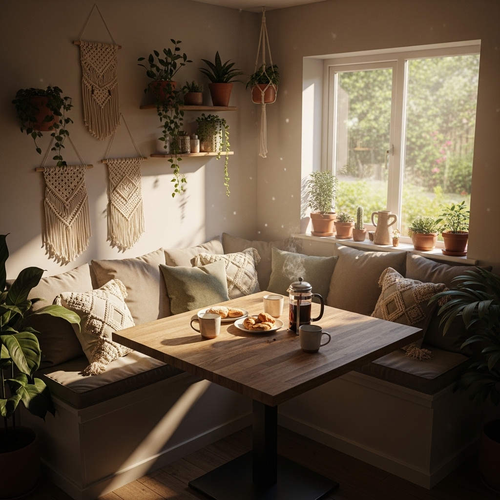 Create a cozy breakfast nook for informal meals and morning coffee. Use a built-in bench with comfortable cushions for efficient seating. Add a wooden table that shows its natural character. Include plenty of pillows for comfort and back support. This dedicated eating area makes your kitchen more versatile and encourages casual gatherings. It’s perfect for quick meals, homework sessions, or simply enjoying your morning coffee in a comfortable spot. Create a cozy breakfast nook for informal meals and morning coffee moments.