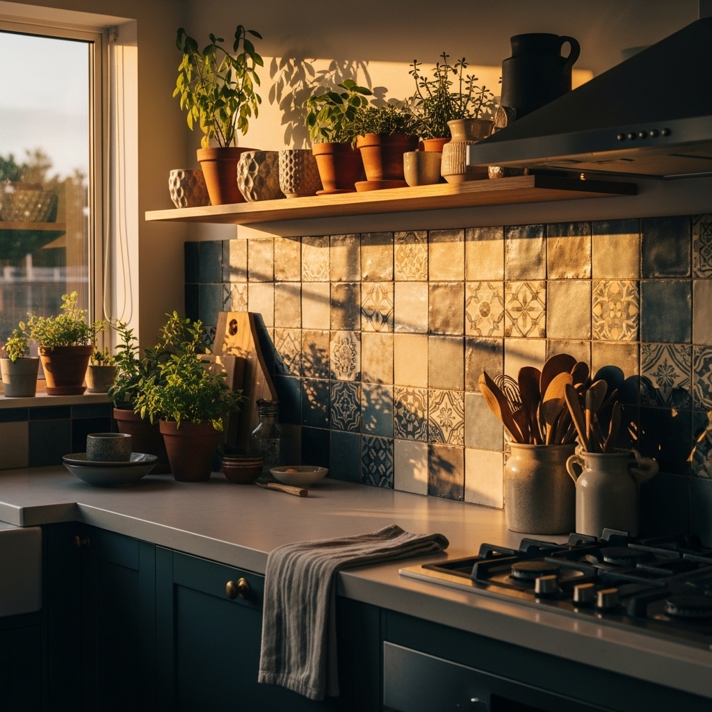 Create visual interest with a mixed material or patterned backsplash. Combine different tile shapes, colors, or patterns in a cohesive design. Consider handmade tiles that show slight variations, celebrating imperfections and artisanal quality. The backsplash is a great place to add pattern and color without overwhelming the entire kitchen. It protects your walls while serving as a decorative element that expresses your creative style behind the practical work surfaces. Add visual interest with a mixed material or patterned backsplash that protects and decorates.