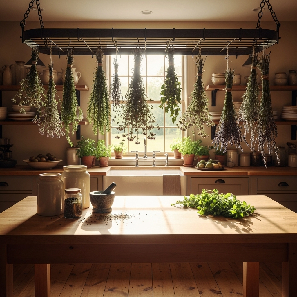 Create a beautiful and functional display with drying herbs. Hang bundles from a rack above your island or near the window. Choose aromatic herbs like lavender, rosemary, or mint that dry well and maintain their scent. This approach adds vertical interest, natural fragrance, and practical cooking resources to your kitchen. The drying herbs create a changing display that connects you to seasonal cooking and natural preservation methods. Create a beautiful display with drying herbs that add fragrance and practical cooking resources.