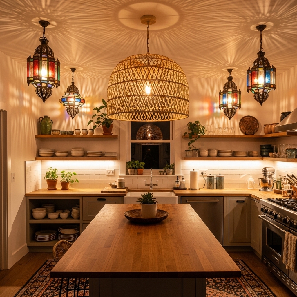 Layer different lighting types for both function and atmosphere. Include task lighting under cabinets for food preparation, ambient lighting for general illumination, and decorative lighting that adds style. Mix fixture styles—a rattan pendant over the island, Moroccan lanterns on shelves, and modern task lighting where needed. This approach ensures your kitchen is well-lit for cooking while creating a warm, inviting atmosphere for gathering. Layer different lighting types for both practical task illumination and warm atmosphere.