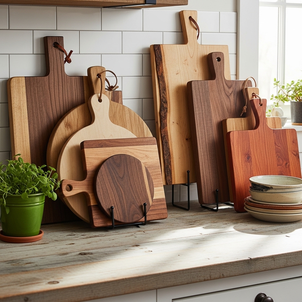 Display your beautiful cutting boards as both functional tools and decorative elements. Choose boards in different woods, sizes, and shapes for visual variety. Lean them against the backsplash, stand them on countertops, or hang them on walls when not in use. This approach keeps your most-used tools accessible while adding natural warmth and texture to your kitchen. The collection celebrates the beauty of functional objects and natural materials. Display beautiful cutting boards as both functional tools and decorative natural elements.