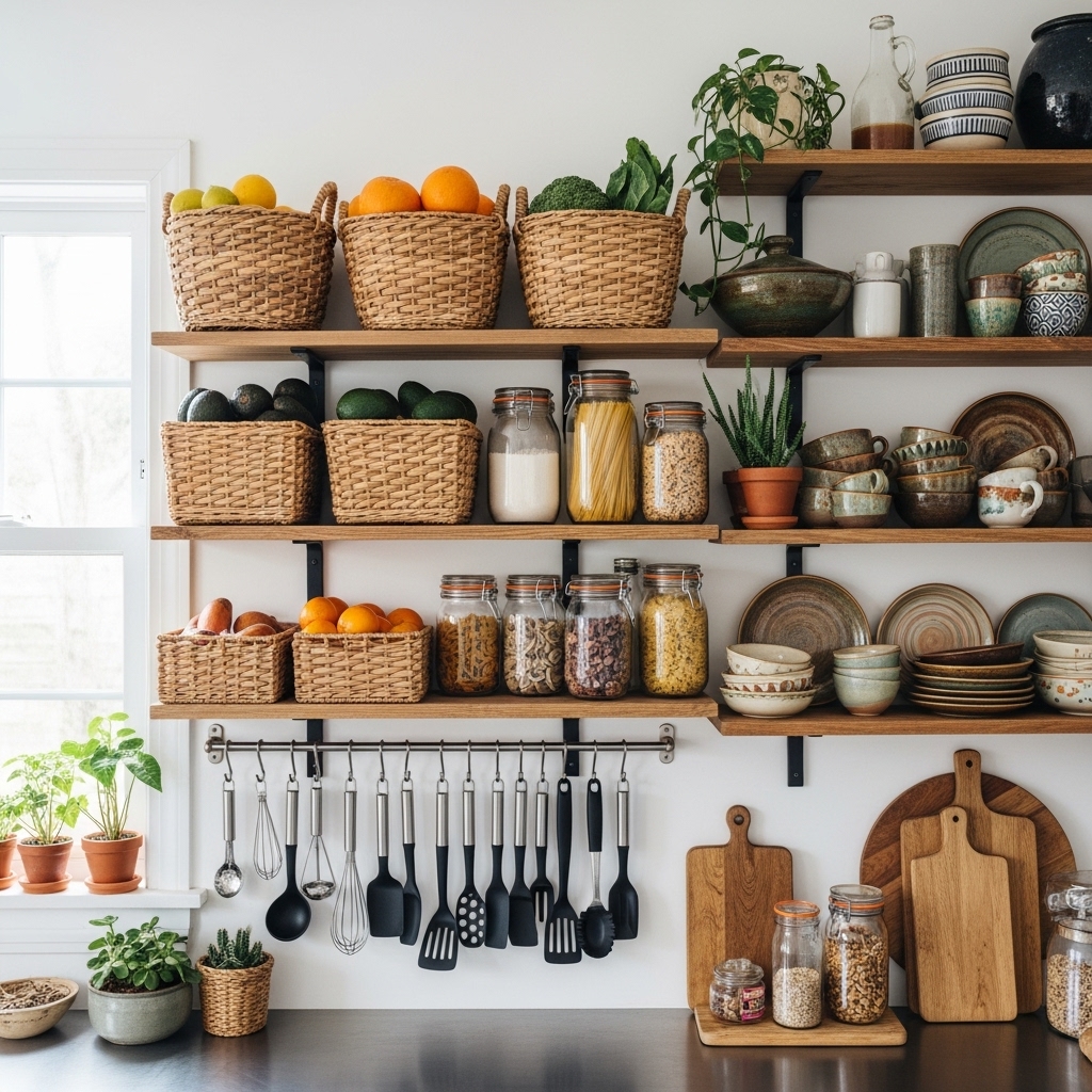Use open storage solutions to keep items accessible and add decorative interest. Install open shelves for beautiful dishes, use hooks for hanging frequently used tools, and incorporate baskets for organizing produce and dry goods. This approach makes your kitchen more efficient while allowing you to display items you love. The open storage adds layers of texture and personality that closed cabinets can’t provide, creating a kitchen that feels lived-in and personal. Use open storage solutions to keep items accessible while adding decorative interest.