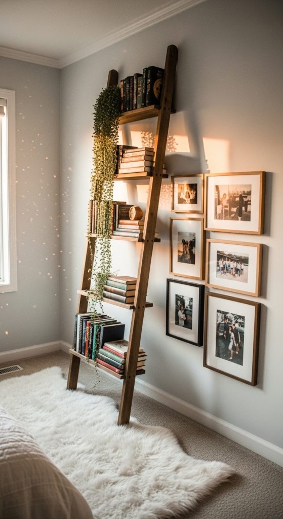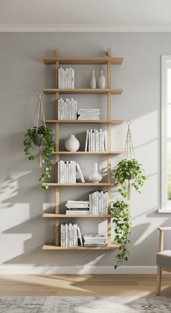 Create a dynamic and modern display with a floating ladder book self. This design adds visual interest and movement to your wall without the bulk of a traditional bookcase. Install natural wood shelves in a staggered, ascending pattern. Style them with a curated mix of books, leaning some horizontally to create platforms for small plants and decor objects. This idea is perfect for a small space, as it draws the eye upward, making the room feel larger. It’s a simple DIY project that delivers a major style impact, creating a light and airy focal point.