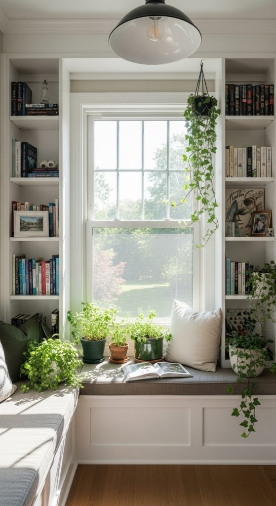Combine your love for reading and plants with a garden window nook book self. This built-in design turns an underused window area into the coziest spot in your home. The shelves flanking the window provide ample space for your library, while the sunlight is perfect for a mini indoor garden. Arrange books by color for a rainbow effect or mix them organically with terracotta pots and vases. This book self idea creates a dedicated retreat that encourages you to slow down, read a chapter, and nurture your plants.