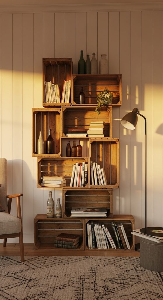 Embrace rustic charm by building a book self from repurposed wooden crates. This is a fantastic, budget-friendly project that adds instant character. Hunt for crates at flea markets or farm stands. You can leave them in their natural state for a weathered look or paint them in a cohesive color palette. Stack them horizontally and vertically to create an interesting geometric arrangement. This book self idea is wonderfully flexible; you can reconfigure it anytime you want a change. It tells a story of resourcefulness and rustic style.