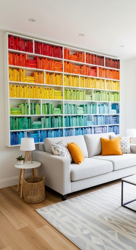 Turn your book collection into a work of art with a color-blocked book self. This organizing method is not only visually striking but also makes finding your books by their cover a fun experience. It transforms a simple shelf into a major decorative statement. For the best effect, use a simple, white shelving unit to let the colors pop. This book self idea is perfect for those who love a bold, cheerful, and orderly aesthetic. It’s a simple change that delivers maximum impact and joy.