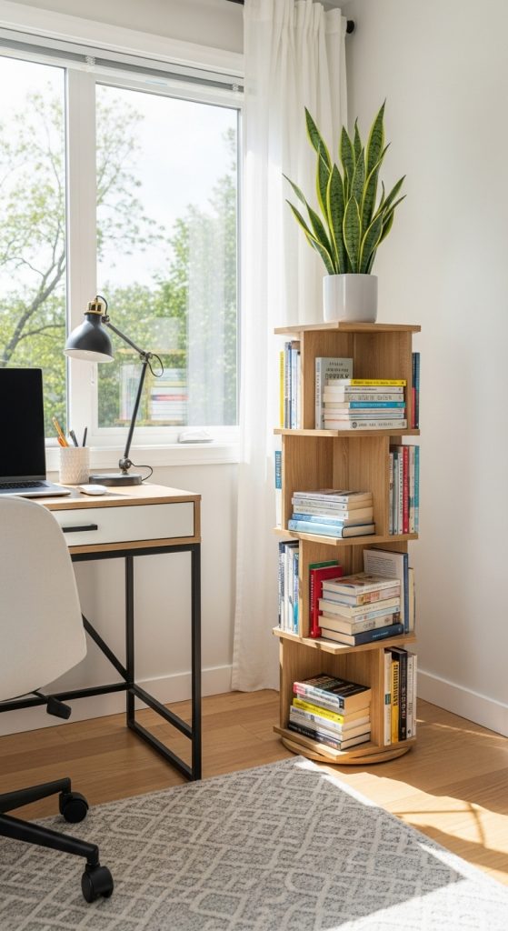Maximize a small footprint with a spinning book tower. This innovative book self holds a surprising number of books in a very small floor space. The ability to spin it makes every volume easily accessible, which is ideal for a home office or a tight corner in a living room. The circular design is soft and modern. It’s a functional piece of furniture that also serves as a interesting sculptural element. This is a brilliant solution for apartment dwellers or anyone looking to save space without sacrificing style.