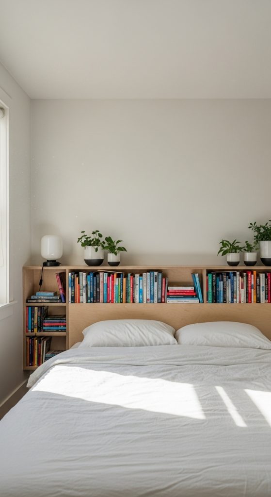 Integrate your love of reading right into your bed with a headboard book self. This clever design saves space and makes bedtime reading incredibly convenient. You can build a floating shelf headboard or repurpose a low bookshelf. Style it with your current reads, a small lamp, and perhaps a calming plant. This book self idea turns your bedroom into a true sanctuary for relaxation and story-filled dreams. It’s the perfect solution for small bedrooms or for any book lover who enjoys reading before sleep.