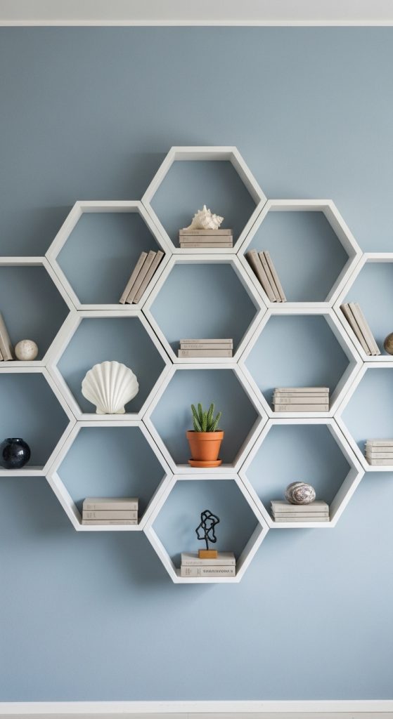 For a truly modern and artistic look, try a hexagonal honeycomb book self. These geometric shelves can be arranged in various patterns on your wall, creating a dynamic and sculptural display. They are best for showcasing a small, curated selection of favorite books or objects. This book self idea is less about mass storage and more about creating a striking wall feature. It’s a perfect choice for a modern home office, a hallway, or above a desk, adding a touch of contemporary artistry.