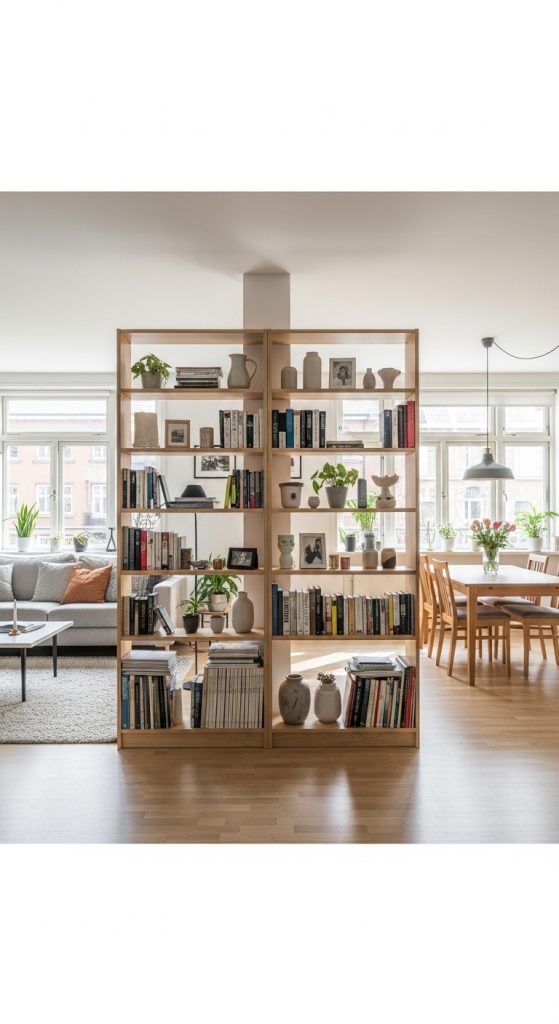 Define your space beautifully with a room-dividing book self. An open-backed shelving unit allows light to flow through an open-plan area while creating distinct zones for living, dining, or working. You can style both sides of the shelf, making it a decorative feature from every angle. This book self idea is perfect for studios or lofts, providing much-needed definition without closing off the space. It’s a functional and stylish way to organize your home’s layout.