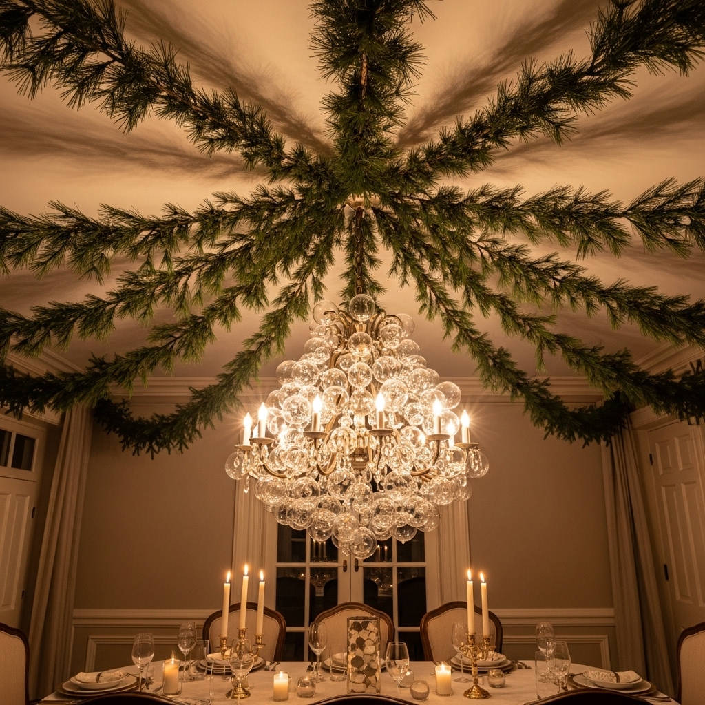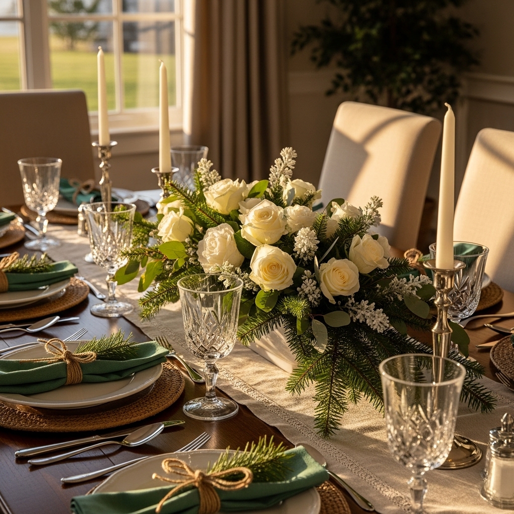 Bring the beauty of a winter garden to your dining table. Create a centerpiece using evergreens and white flowers for a fresh, sophisticated look. Tie napkins with natural twine and add pine sprigs. This elegant Christmas room decor makes every meal feel like a special holiday occasion.