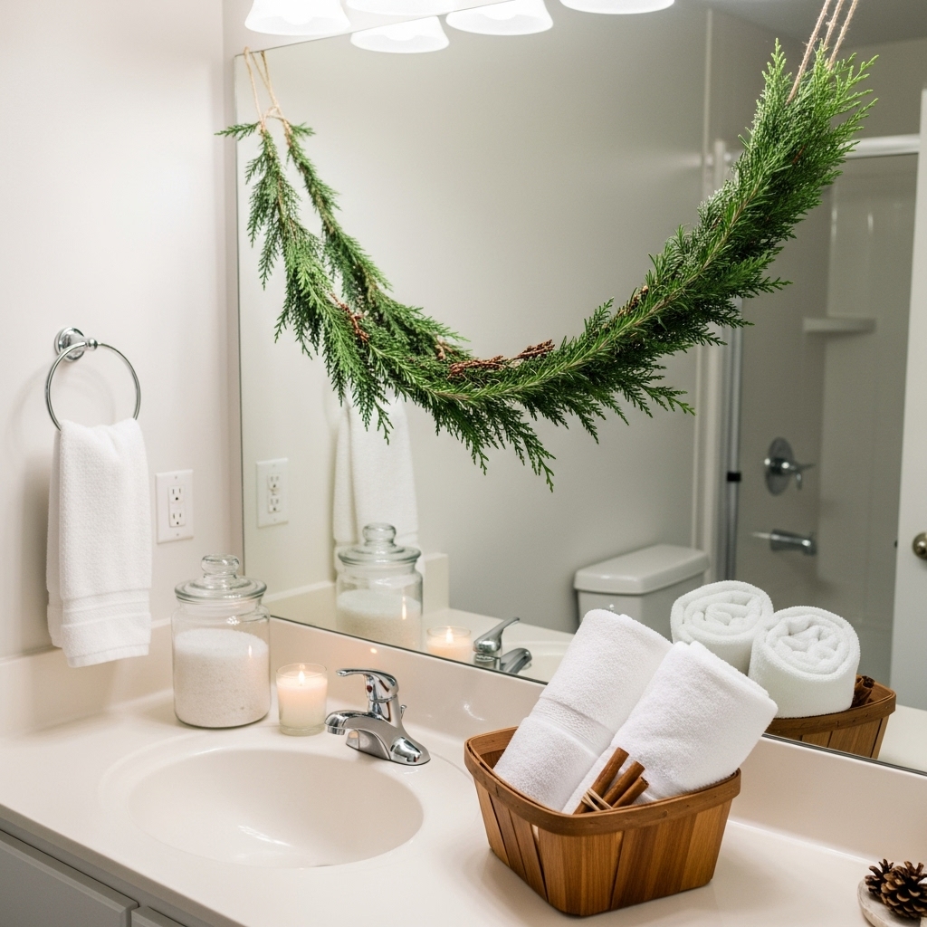 Extend the holiday cheer to your bathroom with subtle, sensory touches. A simple evergreen garland and rolled towels with cinnamon sticks add festive charm. Scented candles or bath salts complete the spa-like atmosphere. This thoughtful Christmas room decor turns everyday routines into special moments.
