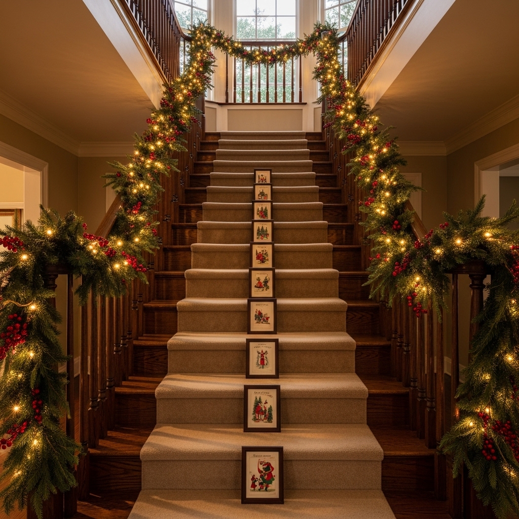 Turn your staircase into a magical pathway. Drape a lighted garland and add clusters of berries or ornaments. Display holiday artwork on the steps for an extra special touch. This dramatic Christmas room decor creates a stunning focal point that guests see immediately.