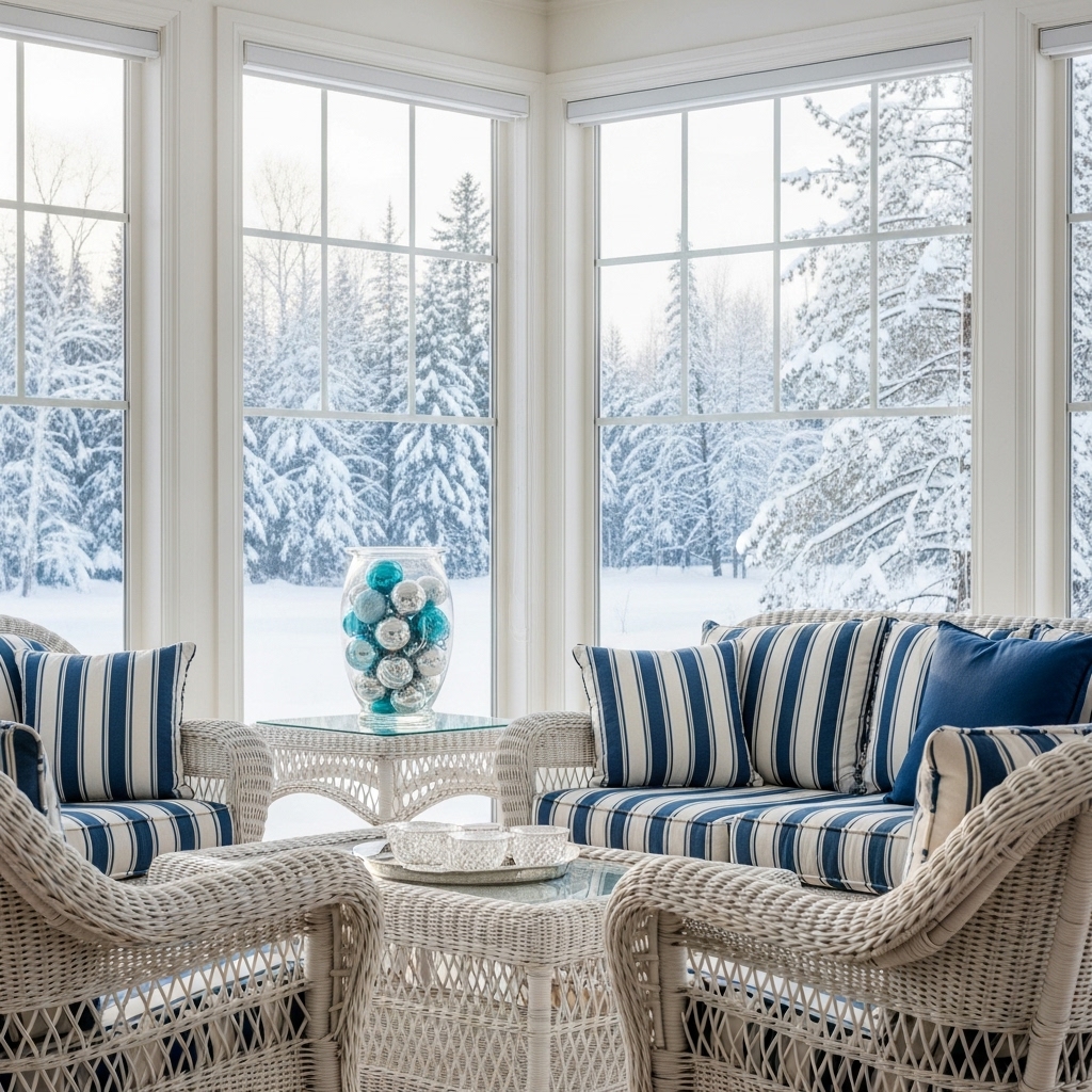Create a bright, wintry feel in your sunroom. Use a cool color scheme of silver, white, and blue. A large vase filled with ornaments makes a beautiful, tree-free statement. This refreshing Christmas room decor captures the crisp, clean beauty of winter while keeping the space light and airy.