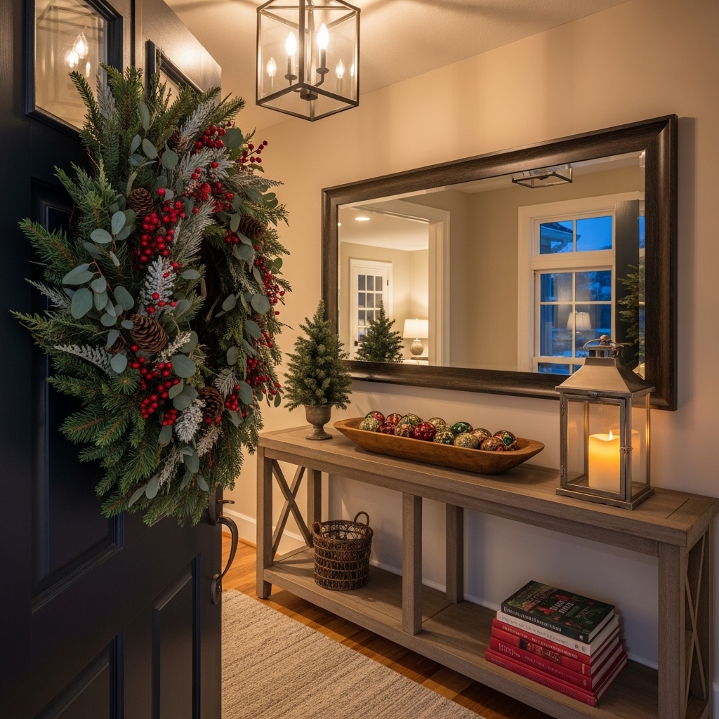 Make a memorable first impression with your entryway. An oversized wreath and a styled console table create instant holiday cheer. A bowl of ornaments offers a colorful, easy-to-change display. This welcoming Christmas room decor ensures the holiday spirit begins right at your doorstep.
