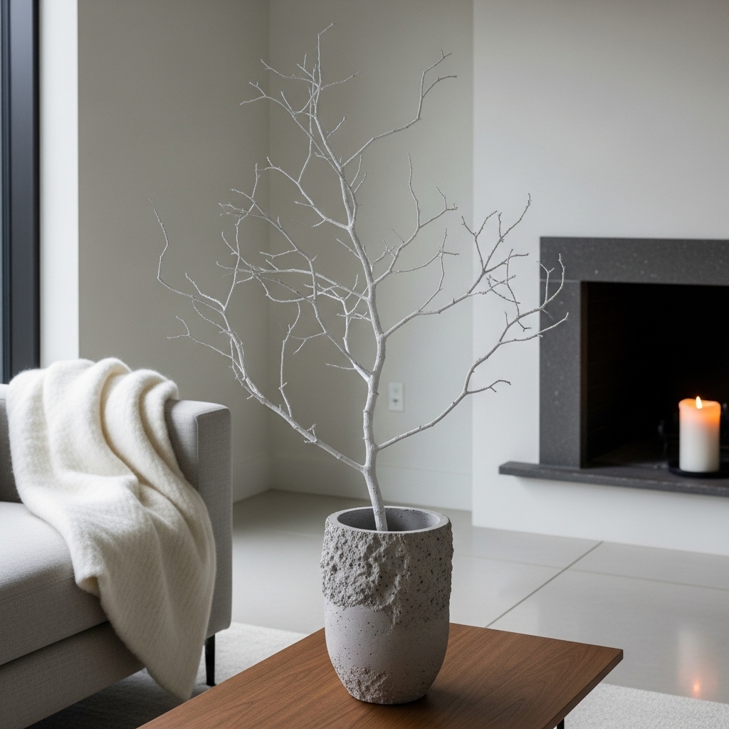 Achieve holiday style without clutter. Choose one or two striking natural elements as focal points. A simple white throw and candle add warmth and light. This minimalist Christmas room decor creates a peaceful, elegant space that feels both festive and restful.