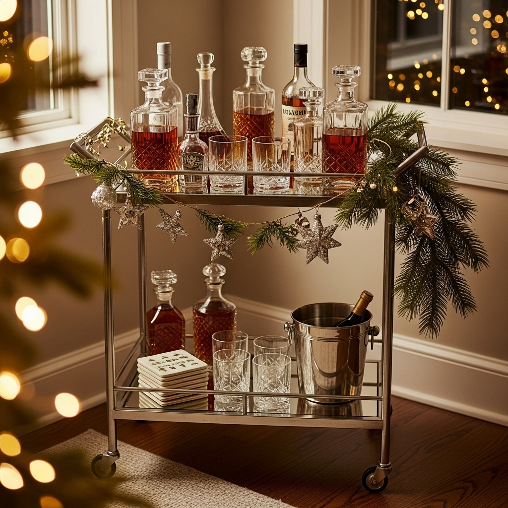 Create a festive spot for holiday cocktails. Style your bar cart with classic glassware and add small, decorative touches like a mini garland or themed coasters. This fun Christmas room decor idea adds a sophisticated, celebratory touch to your living space.