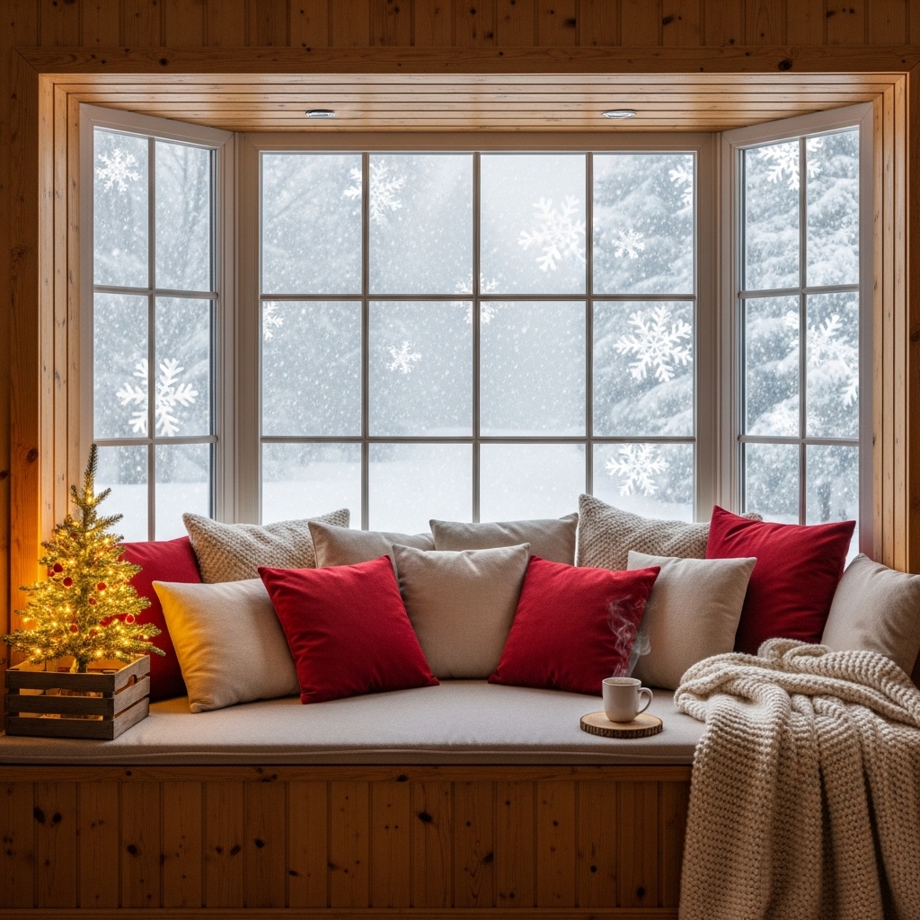 Transform a window seat into a holiday haven. Layer comfortable pillows and warm blankets in seasonal colors. A small, lit tree creates a beautiful glow. This cozy Christmas room decor makes the perfect spot for quiet contemplation or enjoying holiday lights.