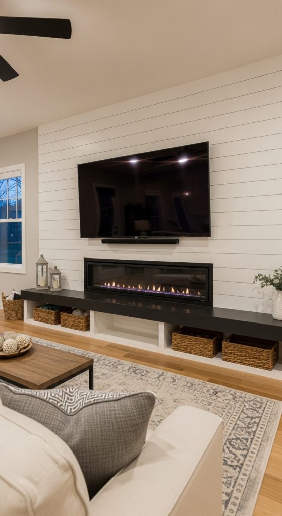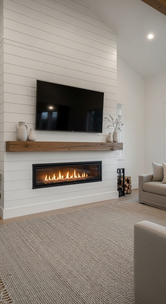 Solve the common design dilemma of the TV and fireplace with a balanced, intentional approach. By choosing a linear fireplace and mounting the TV directly above on a clean, shiplap wall, you create a unified media wall. The key is to ensure both elements are centered and proportional. This modern farmhouse fireplace setup is practical for everyday life, making the room perfect for both cozy movie nights and quiet moments by the fire. It’s a realistic and stylish solution for today’s living.