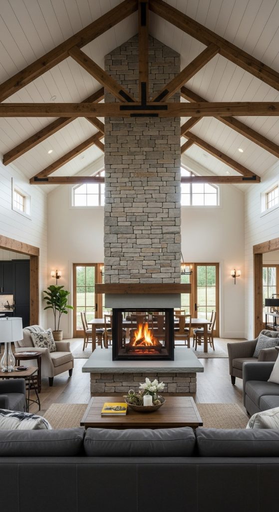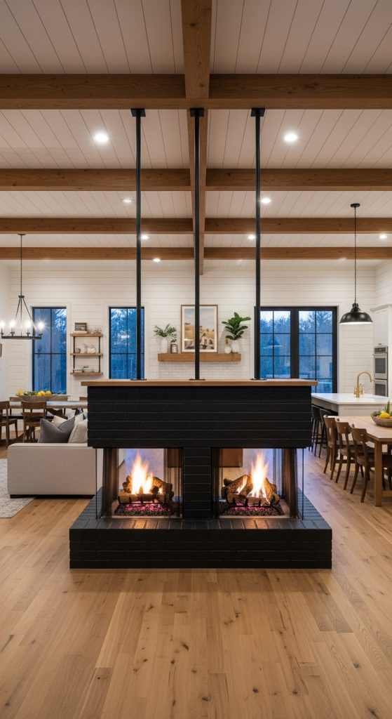 Perfect for open-plan living, a double-sided modern farmhouse fireplace creates flow and connection between spaces. It allows you to enjoy the fire’s ambiance from both the living and dining areas. Use a consistent material like black steel or simple tile on both sides to maintain a cohesive look. This design is fantastic for enhancing a sense of togetherness, even when people are in different parts of the open space. It’s a brilliant architectural feature that maximizes the comfort and style of your home, making it ideal for those who love to host gatherings.