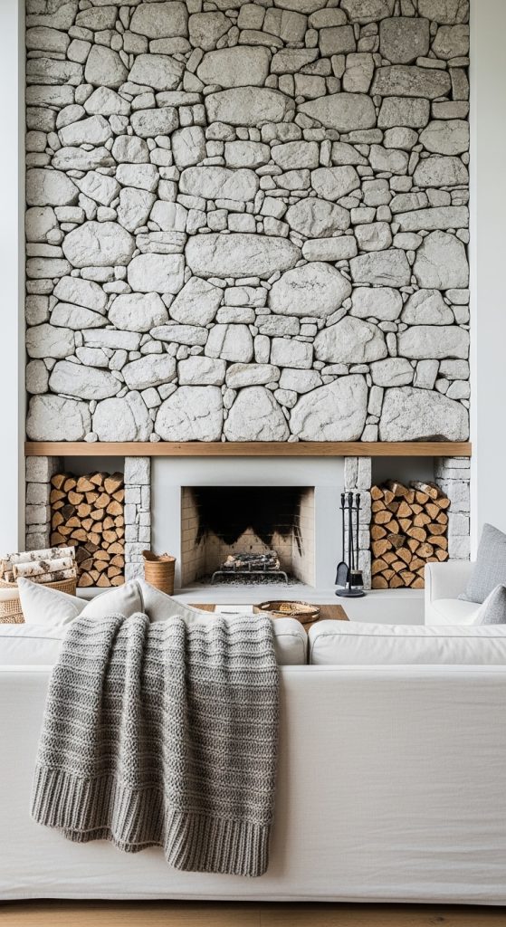 Bring the raw beauty of nature indoors with a floor-to-ceiling stone accent wall. Choose stones in a light, neutral palette like white-washed limestone or gray ledger stone to keep the feeling bright and modern. This approach turns your entire wall into a stunning textural masterpiece. The fireplace itself can be a simple opening within the stonework. This modern farmhouse fireplace idea feels permanent and majestic, adding an incredible sense of depth and character to your space. It’s a commitment to natural materials that pays off in timeless elegance.