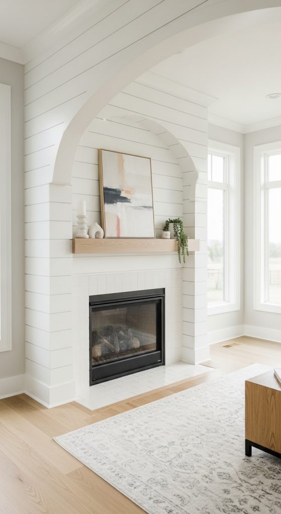 Soften the lines of your modern farmhouse fireplace with a beautiful shiplap arch. This design adds a touch of softness and architectural interest that feels both fresh and traditional. The curved top is a lovely departure from standard rectangular shapes. Instead of a heavy mantel, opt for a slim floating wood shelf to maintain a light, airy feel. This is a perfect idea for a sunroom, bedroom, or any space where you want a calming, graceful vibe. It proves that modern farmhouse style can be both structured and soft.
