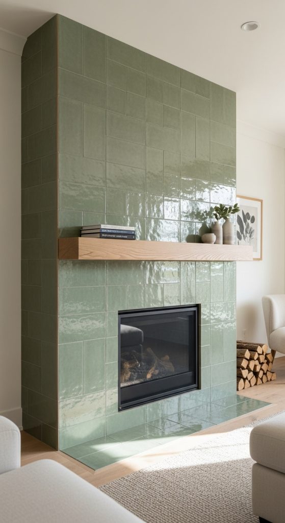 Introduce a soothing pop of color with a green tiled fireplace. Sage, olive, or forest green tiles are a wonderful way to nod to the natural world while keeping a modern aesthetic. The organic, slightly irregular texture of zellige or handmade tiles adds depth and interest. This modern farmhouse fireplace idea feels fresh and calming. It pairs beautifully with natural wood tones and neutral furnishings. Green is a color that promotes relaxation, making this an excellent choice for creating a peaceful living space where you can truly unwind.