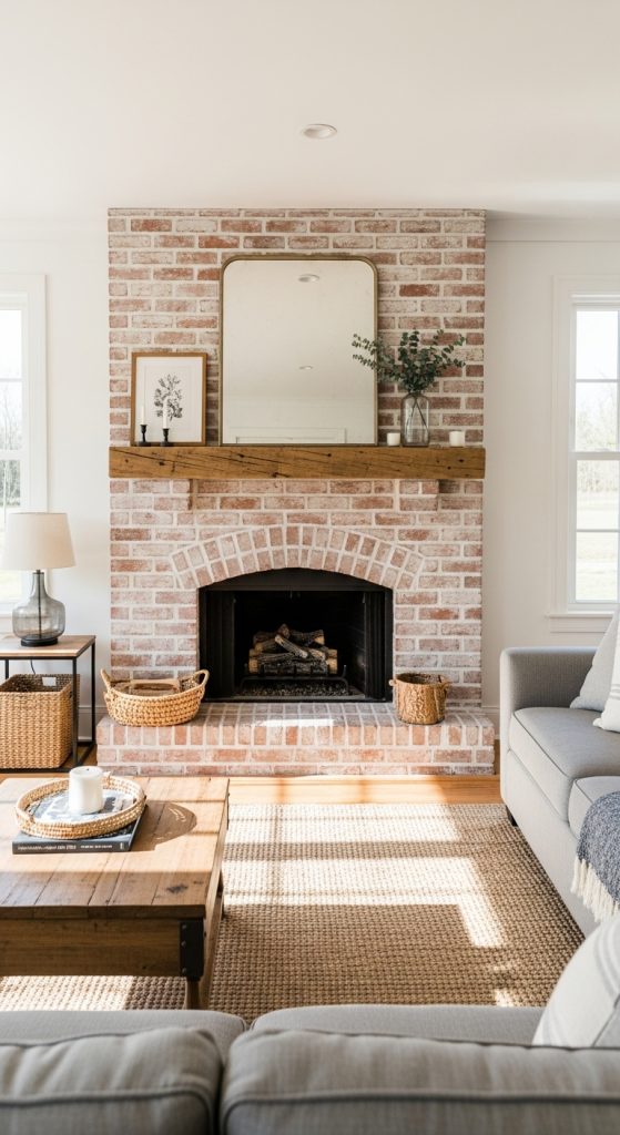 If you have an existing brick fireplace, a whitewash can instantly update it to a modern farmhouse style. This technique lightens the space while preserving the lovely texture and character of the brick. It’s a cost-effective way to achieve a fresh, airy look. Pair it with a substantial wood mantel and simple, modern decor. This approach is perfect for honoring the original architecture of a home while giving it a contemporary lift. It’s a timeless look that feels clean, bright, and welcoming.