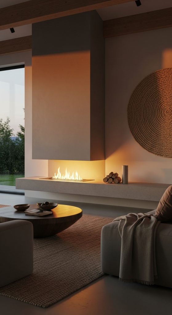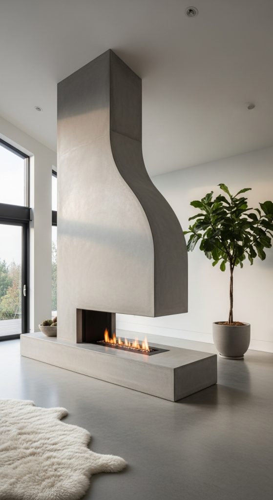 For a truly artistic and modern statement, consider a sculptural concrete fireplace. This can be a custom-poured form that curves and flows, acting as a piece of functional art in your home. The raw, industrial feel of concrete is balanced by the warmth of the fire, creating a fascinating contrast. This modern farmhouse fireplace idea is bold and minimalist. It works beautifully in a home with an open, architectural layout where the fireplace can be appreciated from all angles as a central sculpture.