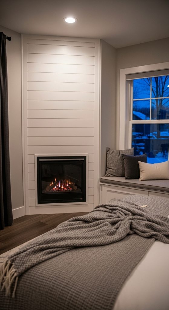 Maximize space and coziness by tucking a fireplace into a corner. This is a smart solution for smaller rooms or for creating an intimate nook in a larger space. Surrounding the corner with shiplap or paneling makes it feel like a built-in feature. Add a comfortable chair or a window seat to create a dedicated spot for relaxation. This modern farmhouse fireplace idea makes brilliant use of often-wasted space, transforming a corner into the most coveted spot in the house for quiet contemplation.