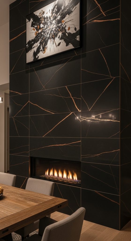 Add a touch of understated glamour to your modern farmhouse fireplace with metallic-accented tiles. Choose tiles with subtle copper, bronze, or graphite veining against a dark background. This introduces a luxurious element without being flashy. It pairs surprisingly well with rustic wood beams and neutral decor, creating a rich, layered look. This idea is perfect for a dining room or master suite where you want to elevate the ambiance. It’s a creative way to incorporate a bit of sparkle and depth.