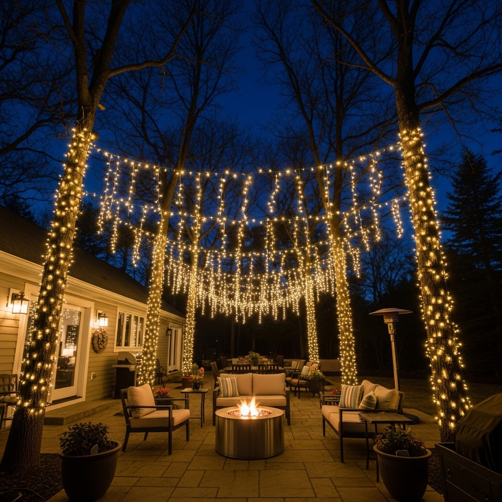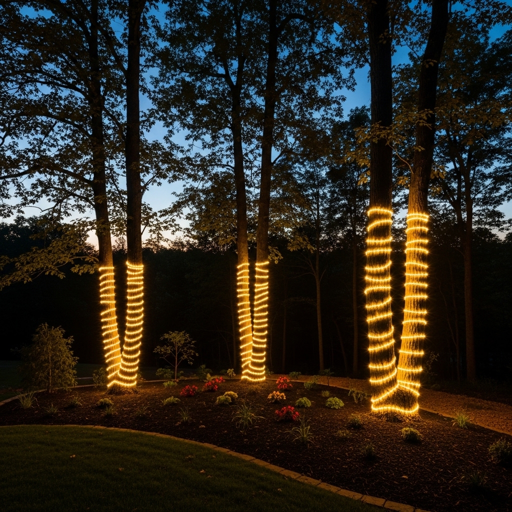Highlight your landscape’s natural architecture with trunk-wrapped trees. Use outdoor lights rated for direct contact with bark. Wrap in a spiral pattern for the best effect. This naturalistic outdoor Christmas lights technique celebrates the beautiful trees already in your yard, turning them into stunning vertical elements of your display.