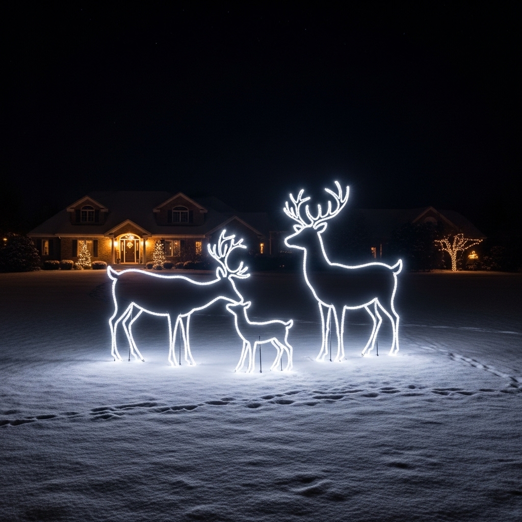Tell a holiday story with light silhouettes. Use rope lights or wire frames to create simple shapes like reindeer, snowflakes, or angels on your lawn. This artistic outdoor Christmas lights approach makes a big impact with minimal materials. It’s perfect for families who want to create a narrative display that captures the imagination.