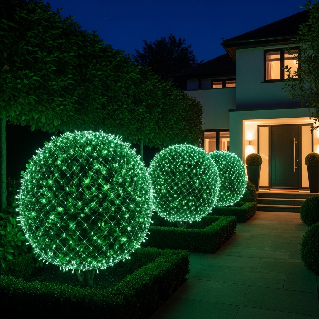 Create perfect glowing shapes with net lights over shrubs. Choose net lights that match your shrub sizes to minimize cutting and tailoring. This efficient outdoor Christmas lights method covers large areas quickly and creates beautifully uniform shapes that look professional and intentional in your landscape design.