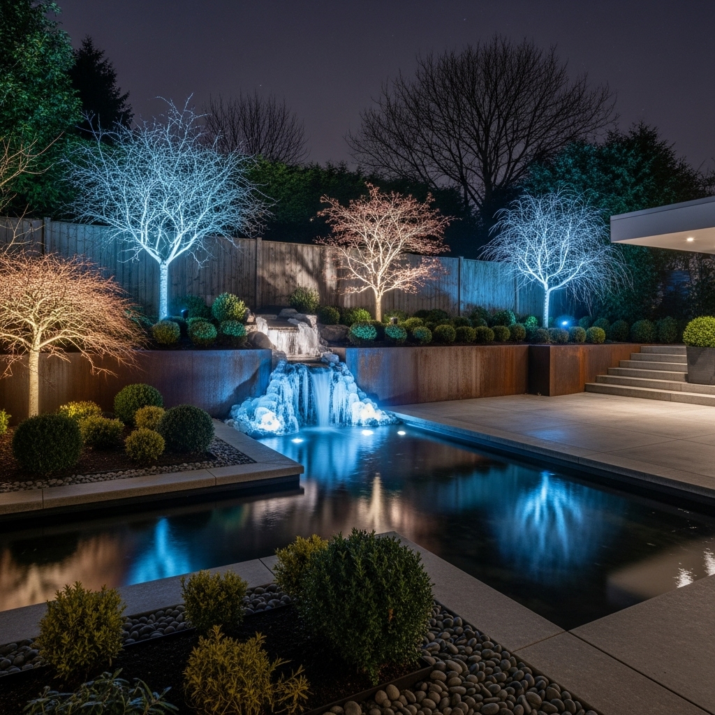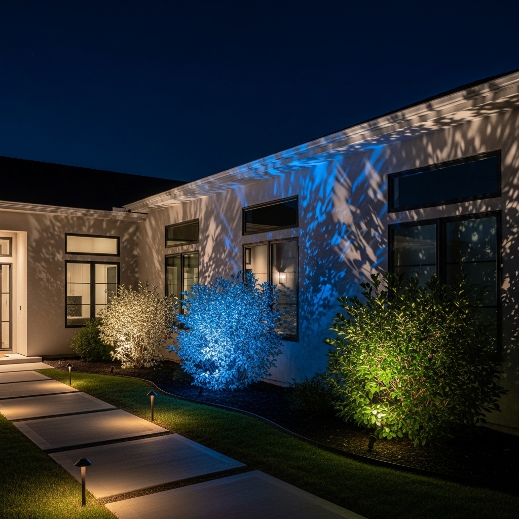 Create an evolving light show with smart color-changing spotlights. Place them to highlight your garden’s best features—trees, sculptures, or water elements. Program gentle color transitions for a mesmerizing effect. This modern outdoor Christmas lights setup lets you change your display’s mood with a tap on your phone, perfect for different holiday occasions.