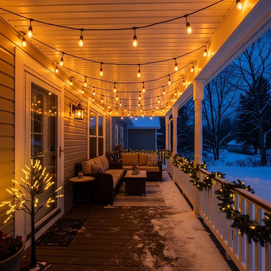 Extend your living space with a warmly lit porch. Hang weatherproof string lights overhead to define the seating area. Add smaller lighted elements for layers of illumination. This functional outdoor Christmas lights concept creates additional space for holiday entertaining and makes your porch the cozy spot everyone wants to enjoy.